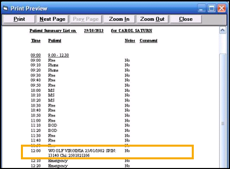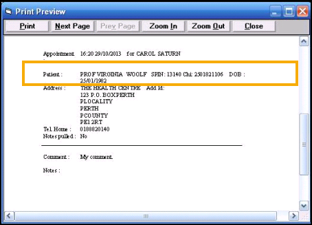 The following patient specific reports display the SPIN and CHI number. The reports are accessed from the Appointments - Search: