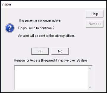 If you select a patient that has been deducted over 28 days ago, a 'This patient is no longer active. Do you wish to continue? An alert will be sent to the privacy officer' message displays':