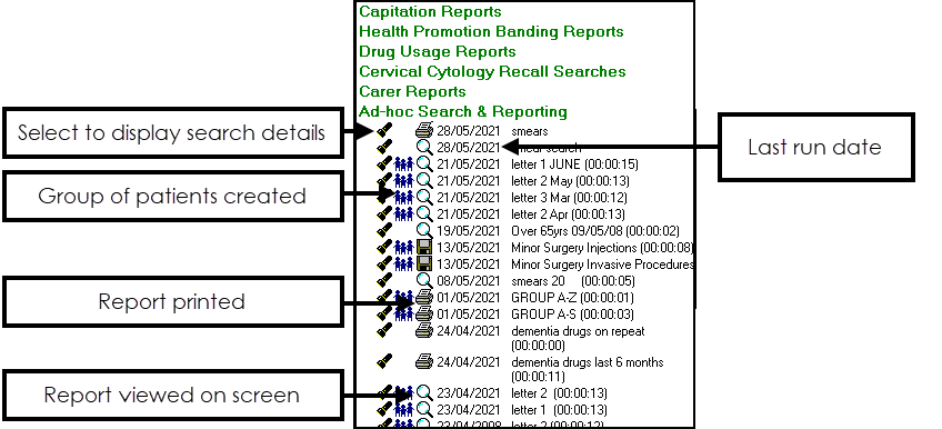 Ad-hoc searches - These are defined by your practice or can be imported from a ICS / Health Board or another practice. You can sort the list of ad-hoc Searches by name or date, and filter by user, date range or keyword in description.