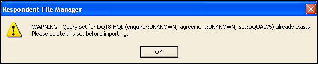 If the Respondent File Manager 'WARNING-Query set for [name of set] (enquirer [name], agreement: [name] set [name] already exists. Please delete this set before importing' message displays when you select Import, you must delete the referenced query set before trying to import again: