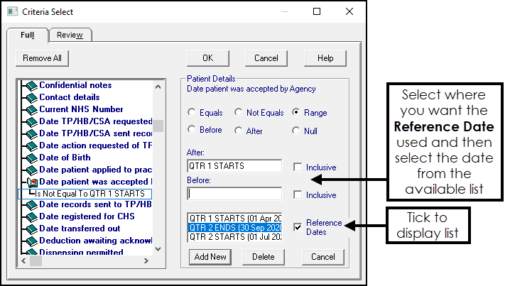 Select the criteria you want to set as a Reference Date and then select the Reference Date required: