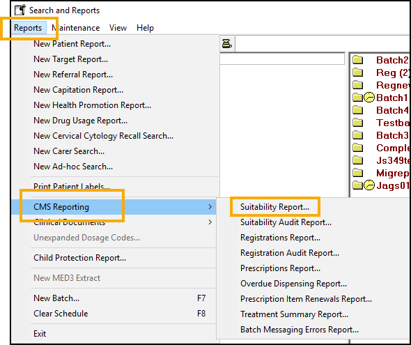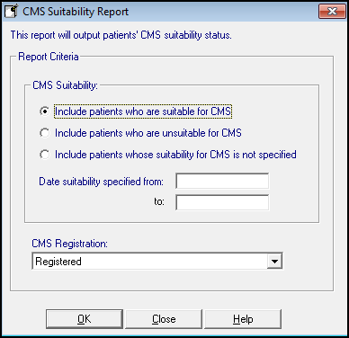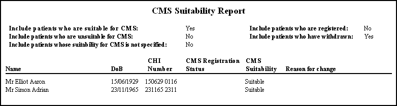 The CMS Suitability Report lists the patients who are flagged as suitable, unsuitable or unspecified for Chronic Medication Service (CMS).