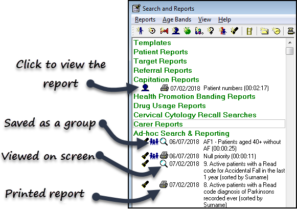 To view a report, select the option to the far left of the name, this varies slightly by category, for example, Search