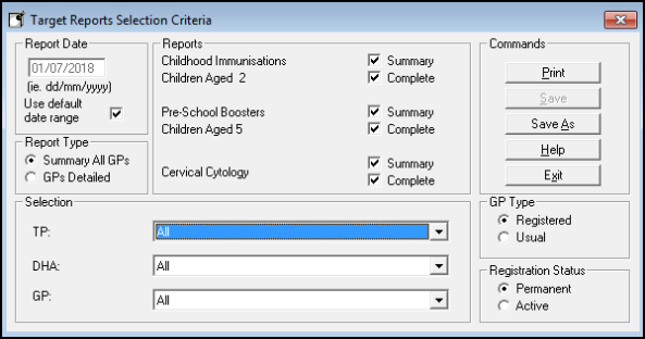Reports - Select Summary and / or Complete for one or more of the following targets:- Childhood Immunisations Children aged 2 - Children aged two with completed courses for the 5-in-one DTPPolHib, DT and Polio, Pertussis, MMR (measles, mumps and rubella), HiB.
