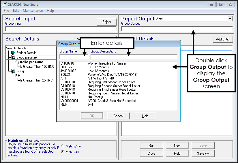 Any saved group can be used later, for example, in Patient Groups to generate letters and recalls, for a further search, or in Consultation Manager which is a very quick way to review patients in the group: