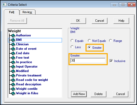 - Choose the criteria you wish to apply to the search and select BMI followed by Add New: