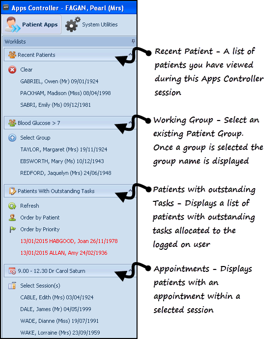 The Worklists panel allows you to navigate a set of patient lists, enabling you to quickly and efficiently process a group of patients within an App. The following groups are available: