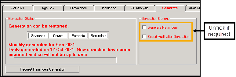 - Generate Reminders - If this is the only audit for which you are generating statistics. If you are about to do your usual monthly generation, leave this ticked.