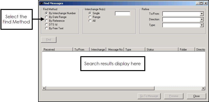 - Range - Enter a from and to number, all messages whose interchange number fall within the range (inclusive) are returned. You can leave the To number blank in which case all messages are included from the From number.