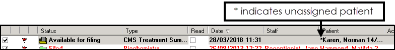 Patient - Messages that arrive without valid patient details must be assigned to a patient before they can be filed. These messages are marked with an *, see Assigning a Patient for details: