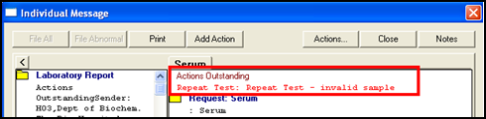 . Remember that a message cannot be marked as read until the whole message has been viewed, ie for multi-tab messages, EACH tab must be viewed by the clinician. Also, unassigned English pathology messages cannot be marked as read. - You can add the same action message to several messages at once. First tick the relevant messages. Then either go to File - Ticked - Actions - [Action Message]; or select the Actions icon, , then select the relevant action message.