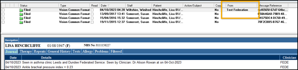 Provenance of Incoming Messages - The From column now displays the origin of incoming Third Party messages, for example, practices that use Shared Care Services, or Third Party products such as Accurx, eConsult and MedLink.