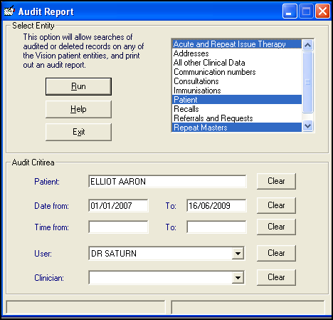 Audit Report allows you to run searches for recorded and deleted records on any Vision 3 patient entities and print out the resultant audit report.