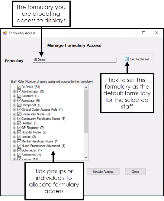 From Staff Role, tick the role-based group to permit the whole group access to the formulary, or using Expand