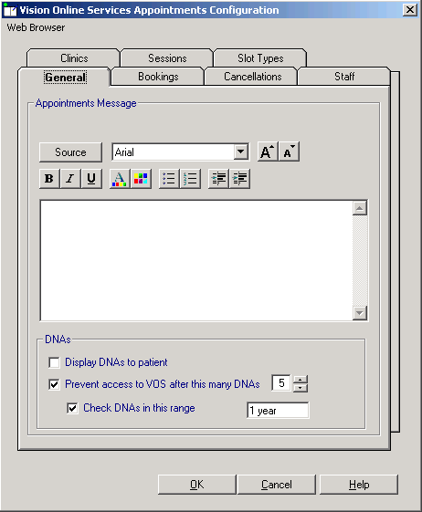 Once you have considered and completed all seven tabs as required, select OK to save and close the Vision Online Services Appointments Configuration screen.