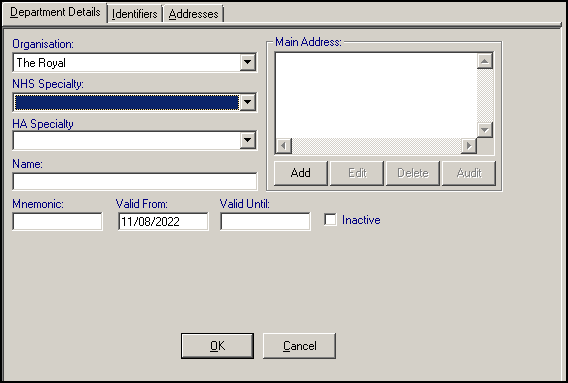• Inactive - Tick if the department is no longer to appear in Department lists in Consultation Manager - Referral - Add.