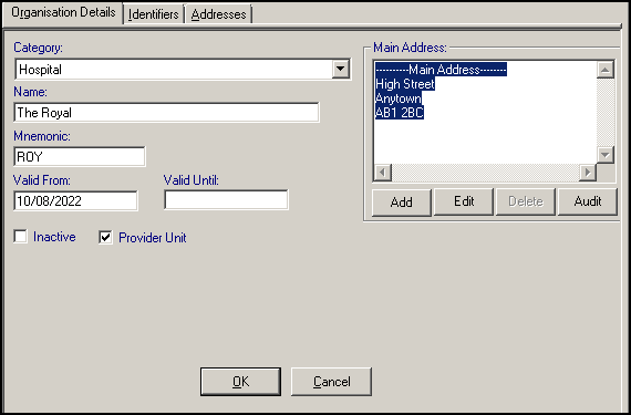 - Identifier Value - Enter a Reference number of the organisation code. For NHS Trusts, the 5 character code begins with R followed by A-9, then A-9, for example, RC1. The final two digits are either blanks or zeros. This then links up with a patient's hospital number and can be entered on referral letters: