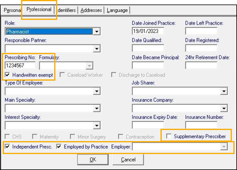 Paramedics, Chiropodist/Podiatrists, Dietitians and PhysiotherapistsPrescribing No - Enter the appropriate Prescribing number. This is a 7 digit code, usually a unique code for each practice worked at, for example '1234567'.