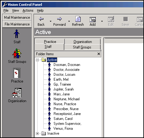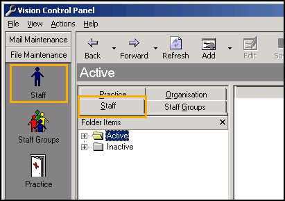 , or the Staff tab to list existing staff. Staff display under two folders:- Active