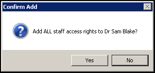 - A 'Add ALL staff access rights to [staff name]?' message displays, select Yes to confirm, or No to cancel the process: