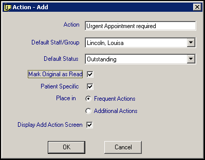 - Default Staff/Group - Optional, select from the available list to assign this particular action to a particular staff member or group, for example, receptionists, or member of staff.
