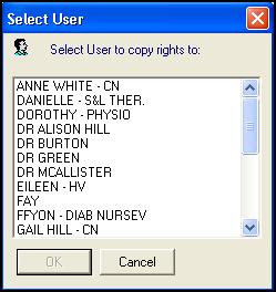 The Select User screen displays, select the new user to whom you want these rights copied and select OK: