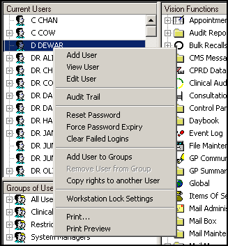• Print - Select to print a list of users together with either their Security Groups or Vision Functions, depending on what is selected in Actions - View Users with Groups or View Users with Functions, see Printing Security Groups and Function Rights for details.