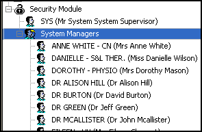In essence, any group that is placed immediately beneath a module heading has access to everything within that module. So if a heading has the group All Users immediately beneath, then all users can access that module. Some modules have Clinical Managers and others, System Managers.