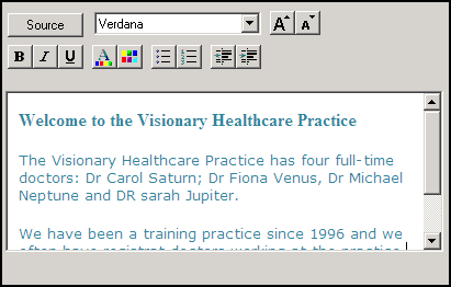 The message editor allows you to format messages displayed to online users. It is available in the welcome, appointments and prescription message online configuration screens: