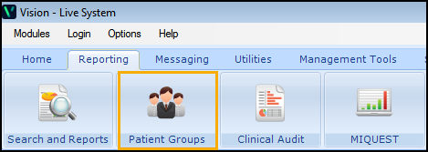 From the Vision 3 front screen, select Reporting - Patient Groups: