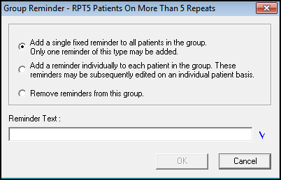 - Global Reminder - Add a single fixed reminder to all patients in the group. Only one reminder of this type may be added - A single reminder added to the group, which cannot be edited or deleted in Consultation Manager.