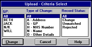 - Record Status - Displays all records, those requiring change, unmatched records or records rejected by the practice. Initially all upload records are marked either Change indicating that a change is processed if accepted, or Unmatched where the record sent cannot be matched with any patient on the database. A Rejected status is created by the practice if rejecting a change: