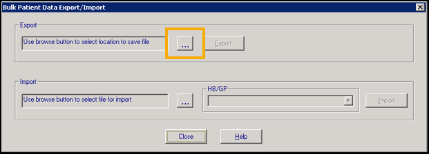 The Bulk Patient Data Export/Import screen displays, under Export select Browse