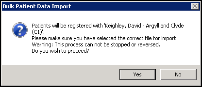 Once you have completed the list, repeat steps 2 - 7 again and this time the file should pass validation and the Bulk Patient Data Import message displays, select Yes to confirm your selections are correct: