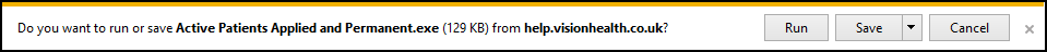 - Select the search. A warning message displays 'Do you want to run or save XXXX from help.visionhealth.co.uk?':