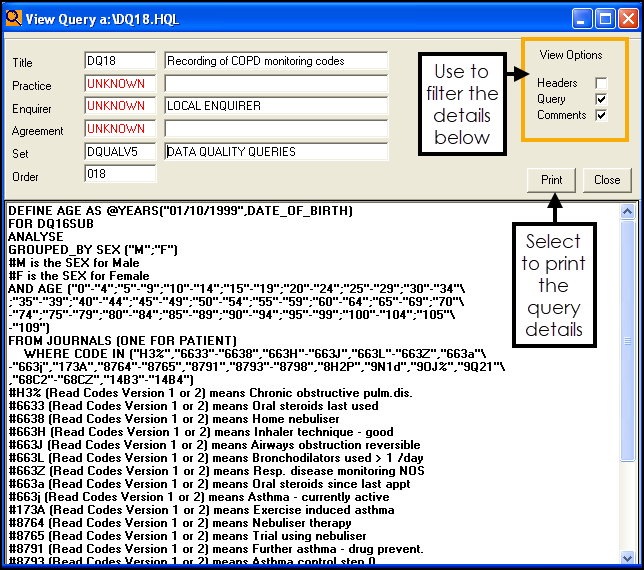 The View Query screen displays showing the text of the query, this can be filtered using View Options: