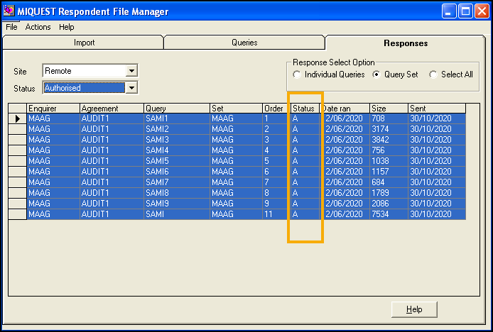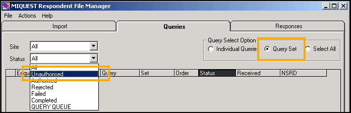 From Status, select Unauthorised, or select Query Set which automatically selects all unauthorised queries in this set: