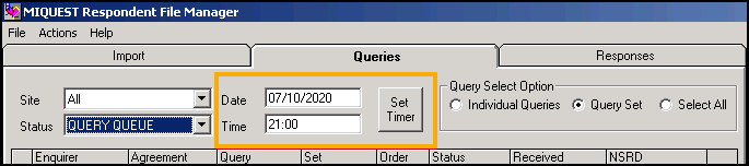 Select Actions-Run Later, enter a Date and Time to run the queries and then select Set Timer. The 'Timer has been set for dd/mm/yyyy hh:mm:ss' message displays, select OK to continue: