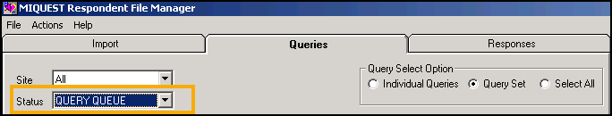 The MIQUEST Respondent File Manager screen displays with the Queries tab selected: