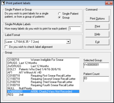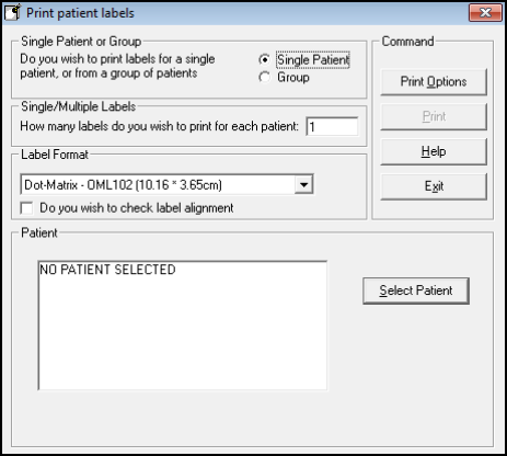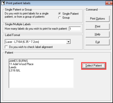 Address labels can be printed for a single patient or a group of patients. Label printing can also be carried out from the Patient Groups module.