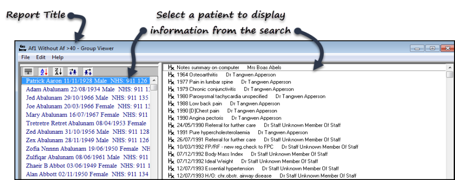 The Group Viewer screen displays, with the description of the search in the title bar. The left-hand screen lists the patients found.