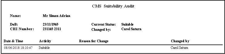 The CMS Suitability Audit Report is an individual patient report listing historical changes in Chronic Medication Service (CMS) suitability status.