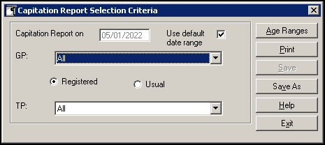 - Capitation Report on - The date defaults to today, remove the tick from Use default date range to update if required.