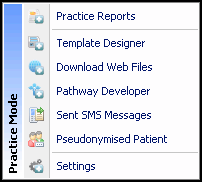 in the Windows Notification Tray. Note - If you want to access the Vision+ modular menu options whilst in Consultation Manager, make sure you do not have a patient selected, otherwise patient-centric menu displays. - Select the required module from the Practice Mode menu. You can select from: