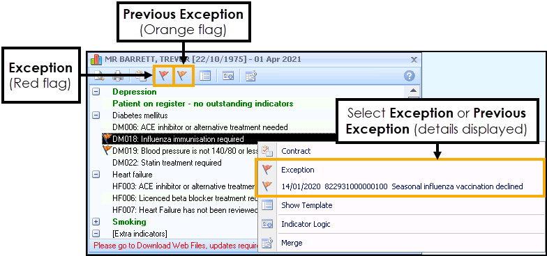 Previously used Exception codes for the selected patient are represented with an Orange flag .