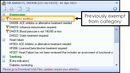 Where a patient was previously exempt from a full clinical domain, the whole category title displays in Orange: