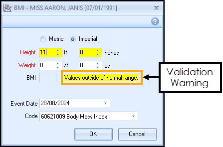 BMI Calculator - If you enter an erroneous value into the BMI Calculator a warning displays: