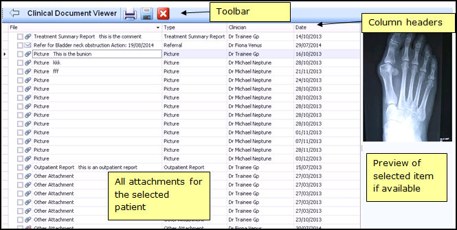 allows you to see all documents from a selected patient record in a single location. This enables you to view and print one or more attachments for the selected patient. This facility is really useful for sending printed or saved to disk copies of patient attachments when a patient is transferred out: