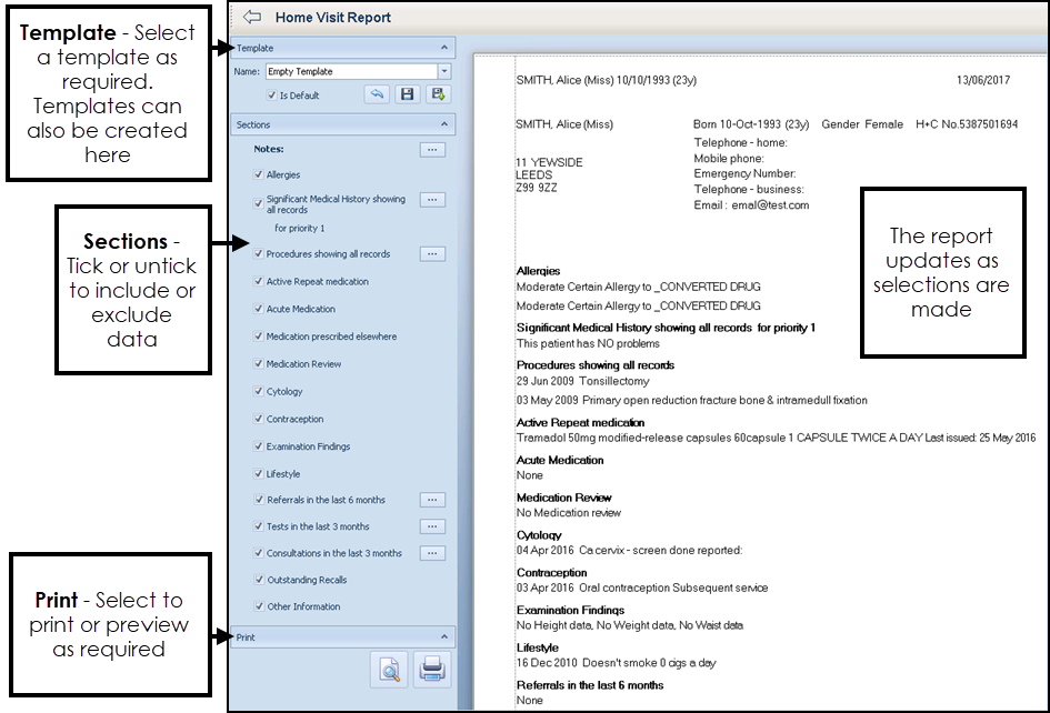 , select any patient. - Select the criteria you require from Sections, see Selection of Criteria for details.