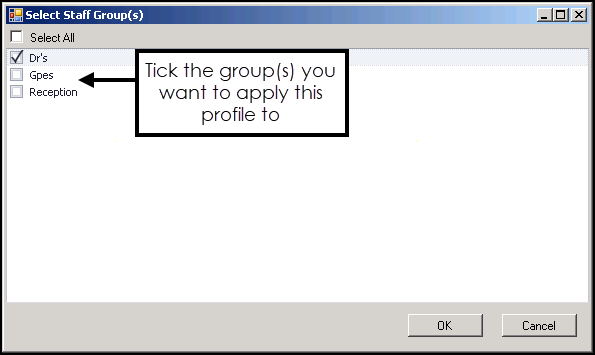 - Either tick Select All or tick the staff groups you want to allocate the selected profile to: